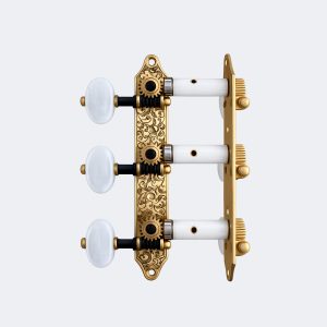Su estructura en acabado dorado con grabado ornamental aporta un toque artesanal y sofisticado, mientras que los rodillos en color blanco crean una estética limpia, luminosa y muy equilibrada. Este contraste lo convierte en un clavijero perfecto para guitarras de gama media y alta, así como para proyectos de luthier que buscan un acabado cuidado y diferencial.